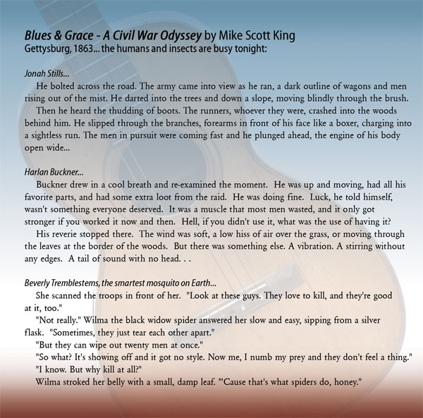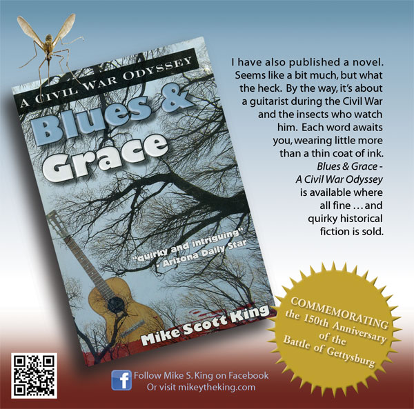 The novel begins with Robert E. Lee in his quarters three days before the beginning of the Civil War Battle of Gettysburg. As the battle rages, the novel continues on its quirky, intriguing way following soldiers as they investigate a boarded-up farmhouse, or, as one does, contemplate desertion. All of this is accompanied by a chorus of insects - primarily mosquitoes - who ruminate and philosophize about the state of mankind.